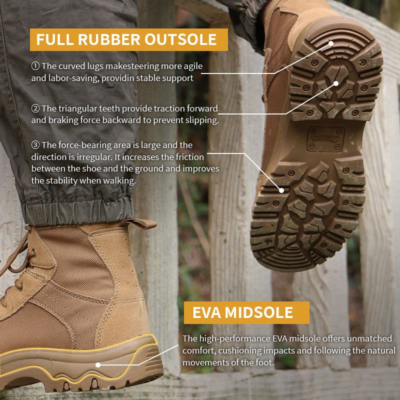 सबैभन्दा कठिन भू-भागको लागि डिजाइन गरिएको, Cordura Fabric रबर डेजर्ट ट्याक्टिकल बुटहरूले हल्का आराम र गम्भीर स्थिरता प्रदान गर्दछ — ताकि तपाईं ढुङ्गा, बालुवा र बीचको सबै कुरामा आत्मविश्वासका साथ अघि बढ्न सक्नुहुन्छ। Cordura माथिल्लो भाग घर्षणको लागि खडा हुन्छ र भग्नावशेष बाहिर राख्छ, माइल पछि माइल। अन्डरफुट, एक उच्च-प्रदर्शन EVA मिडसोलले प्रत्येक स्ट्राइकलाई कुसन गर्दछ र तपाईंको स्ट्राइडसँग स्वाभाविक रूपमा सर्छ। र रबर आउटसोल? यसले खुकुलो जमिन र नराम्रो बाटोलाई एकै किसिमले समात्छ—अनुकूलन गर्नको लागि बनाइएको, अन्तिमसम्म बनाइएको।
