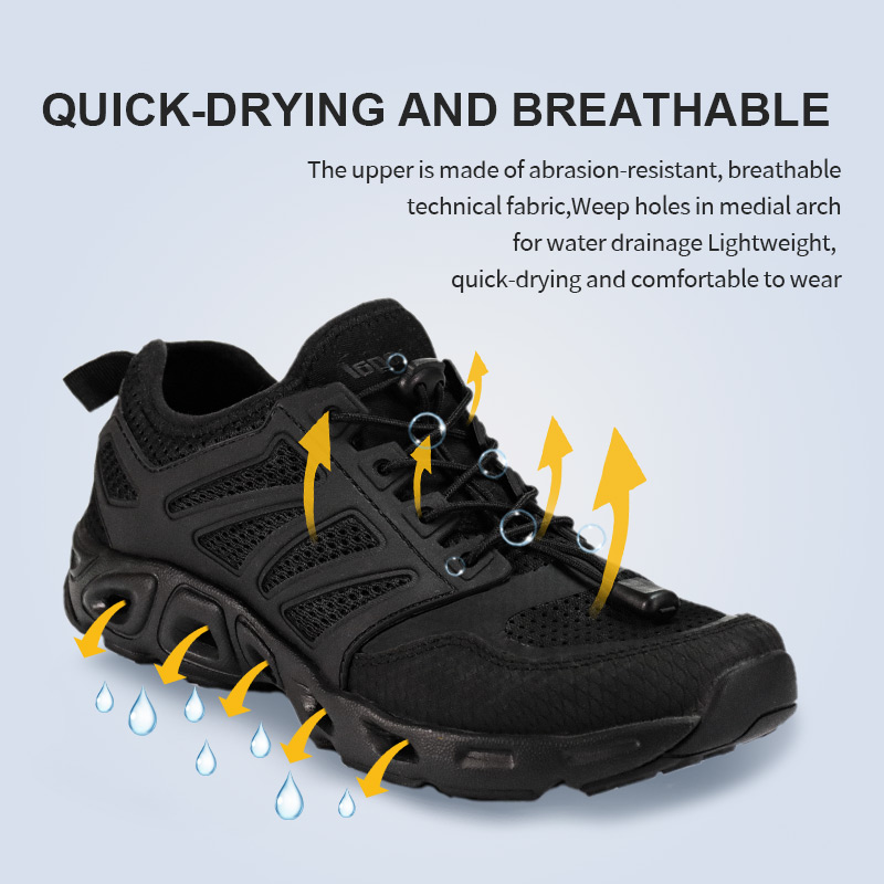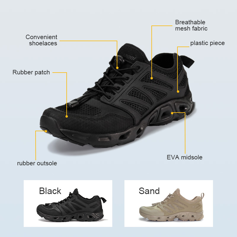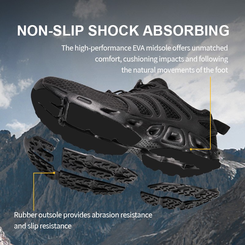 EVA Shock Absorbing Tracking Shoes ट्रेलको लागि बनाइएको छ - भिजेको वा सुक्खा। आर्चमा द्रुत-सुकाउने सामग्री र जल निकासी पोर्टहरूको साथ, जब तपाईं स्ट्रिमबाट शिखरमा जानुहुन्छ यसले छिटो पानी बगाउँछ। रबरको हिल प्याच स्थिरतामा लक हुन्छ, जबकि EVA मिडसोलले खुट्टामुनि नरम, झटका-अवशोषित आराम प्रदान गर्दछ। र असह्य रबर आउटसोल? चट्टान, माटो, ढिलो बजरी को बारे मा केहि पनि समात्न को लागी निर्मित। यो उभयचर, फुर्तिलो, र तपाईंसँग सार्नको लागि निर्मित छ।